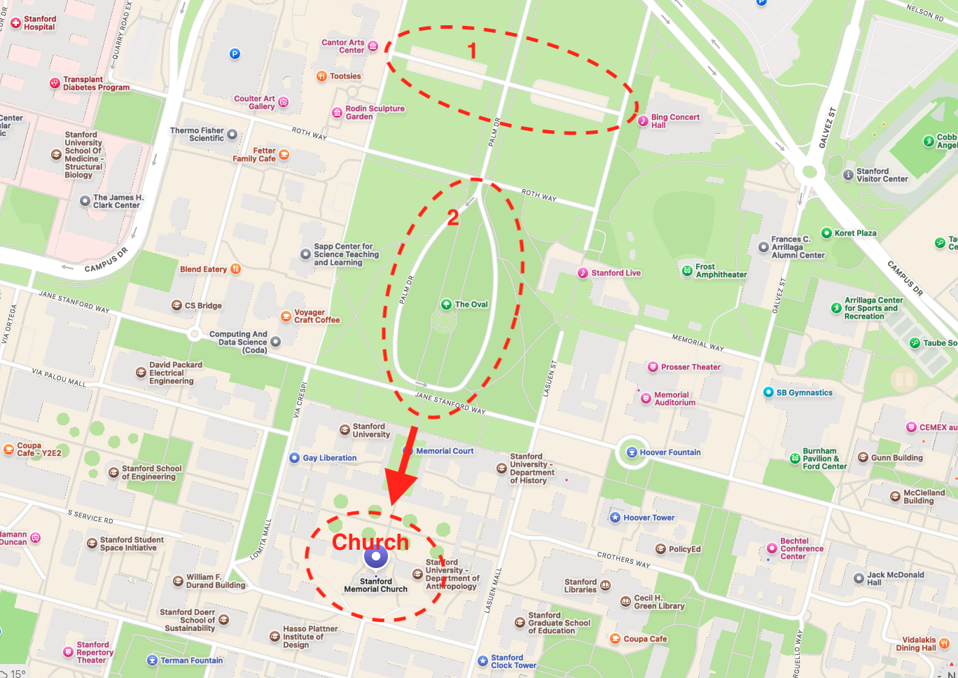 2. Stanford Oval (20 Palm Dr, Stanford, CA 94305) ~ 10 min walk